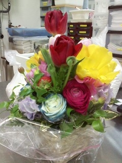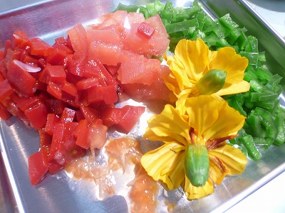 このカラフルなお野菜&ローズマリーのお花を、お肉のソースに使いました